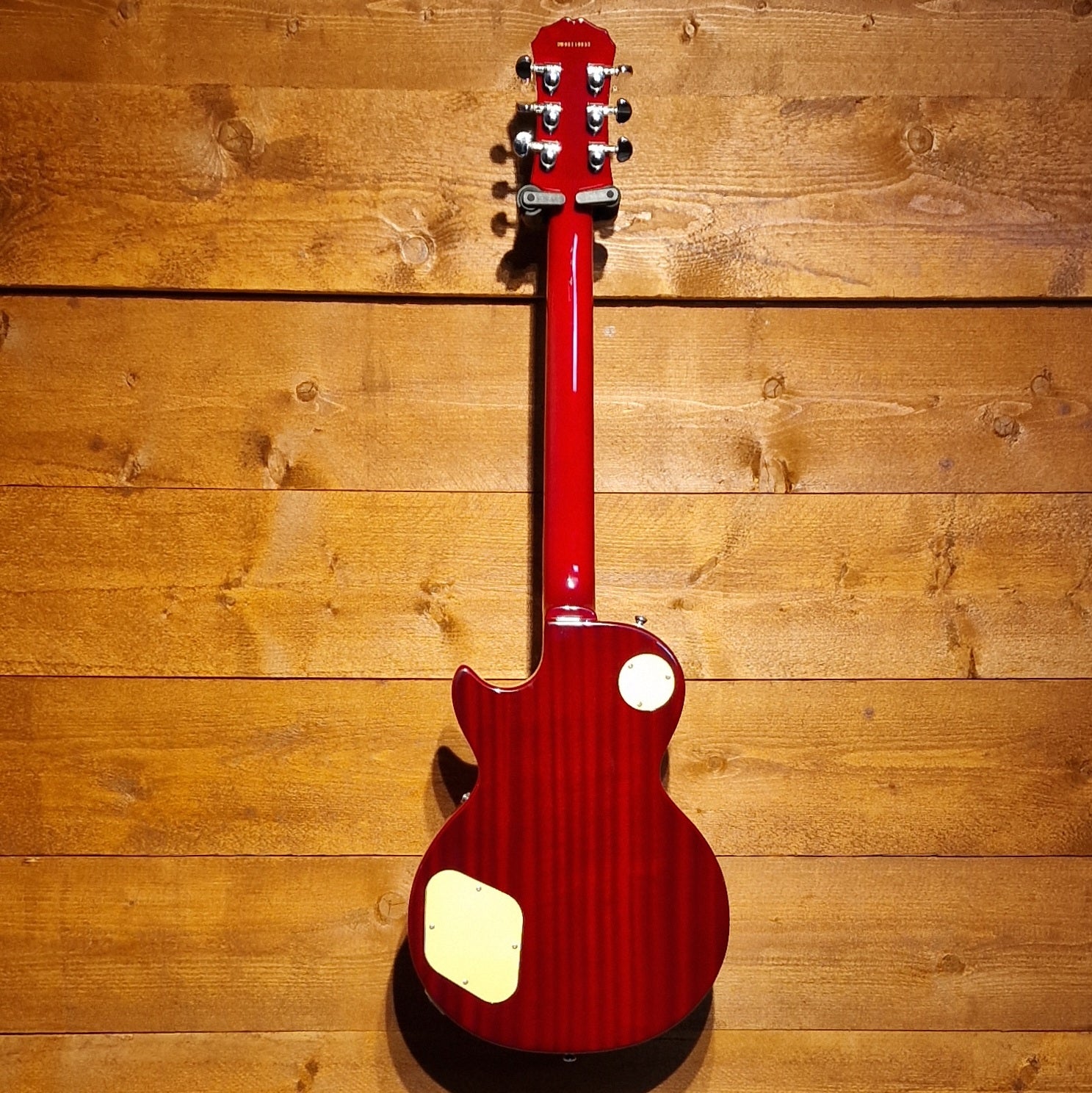 The guitar is crafted with a mahogany body, maple cap (AAA veneer on figured tops), bound 50s shaped mahogany neck with long neck tenon, Indian laurel fingerboard with classic trapezoid inlays, Epiphone's new Vintage Deluxe tuners, a pair of critically acclaimed Epiphone ProBucker humbuckers, and gold Top Hat knobs with dial pointers.