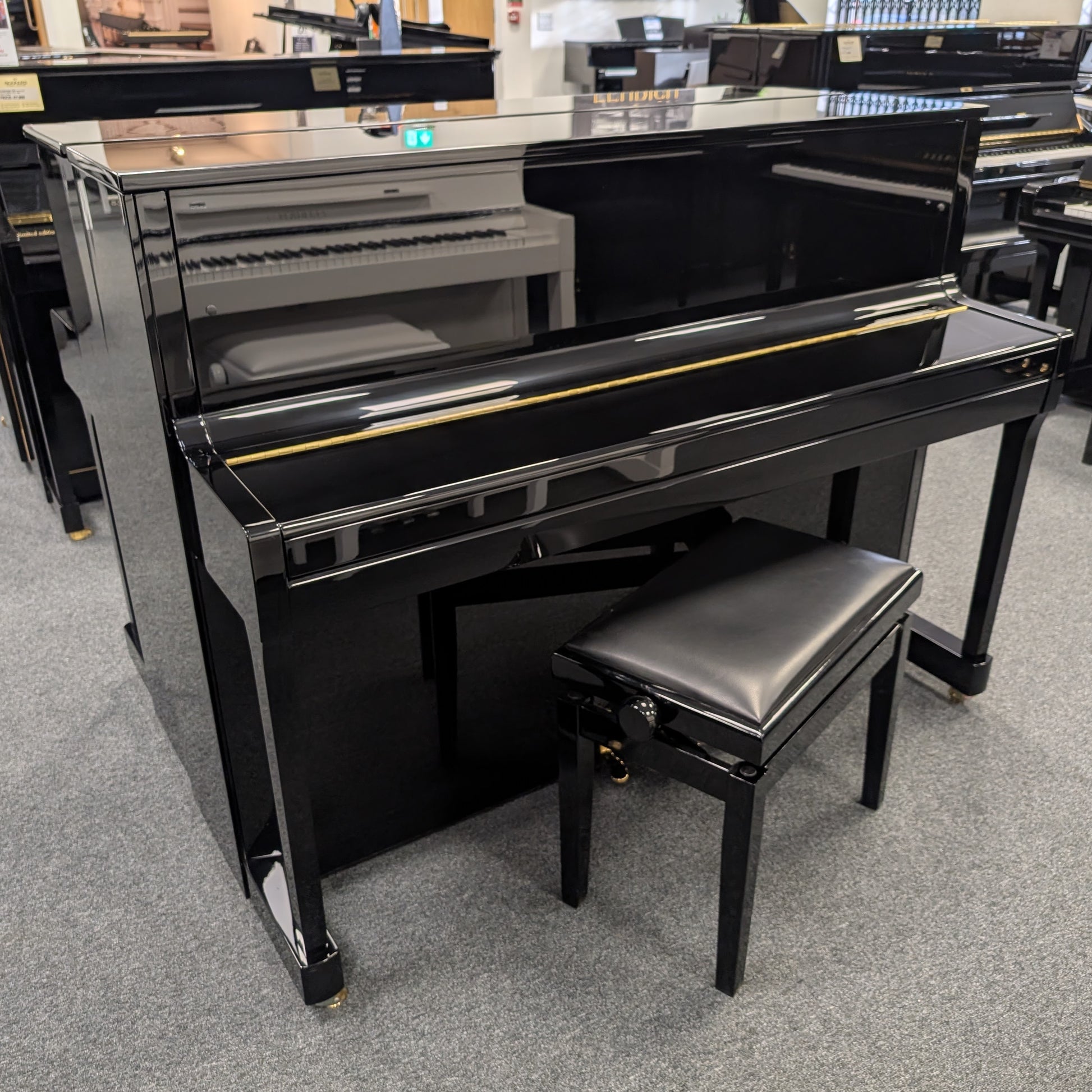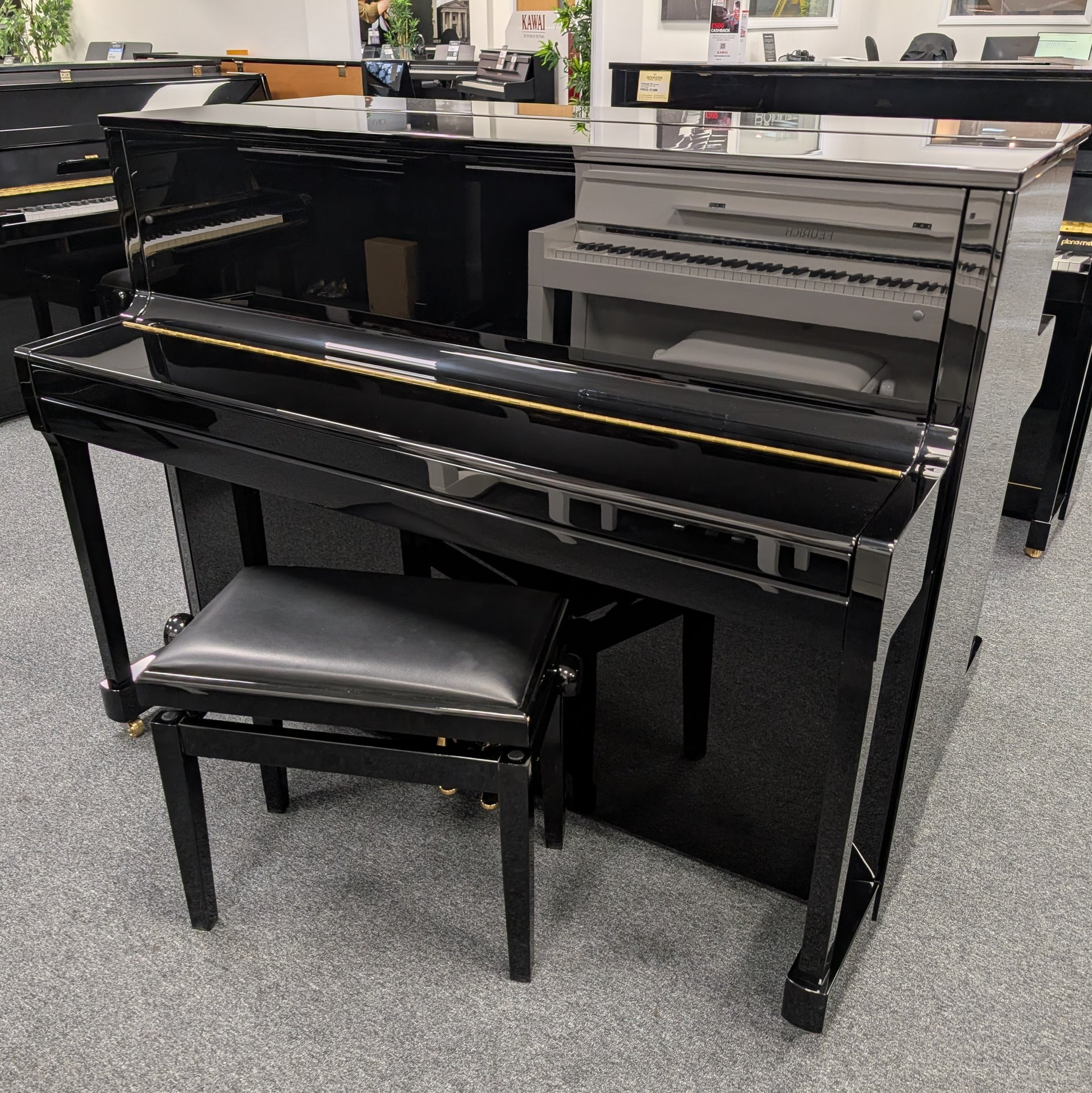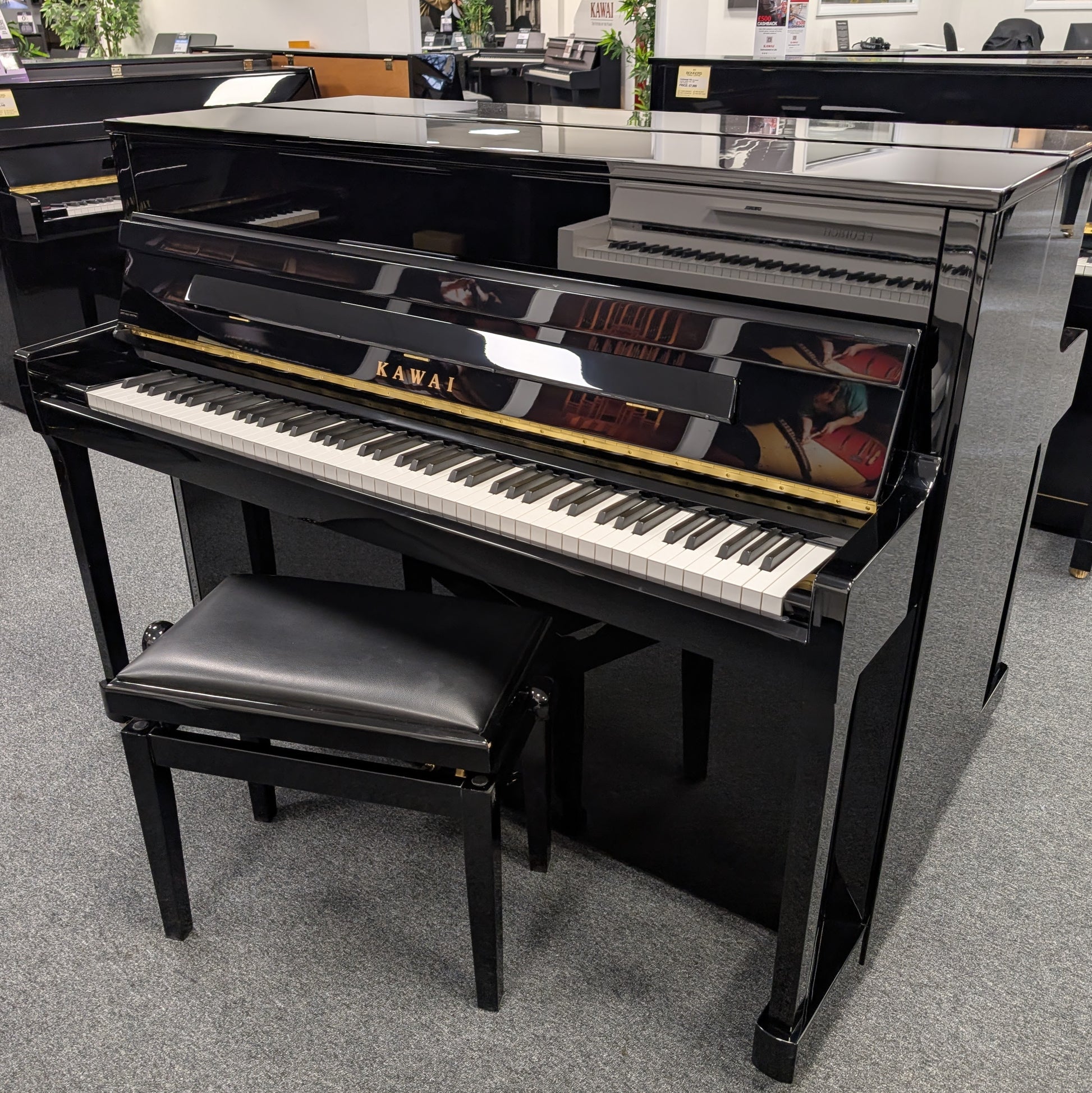 The Kawai K200 is one of our most popular compact upright pianos, offering a wonderfully responsive touch and a beautifully balanced tone that belies its size. This particular example, finished in polished ebony with striking brass fittings, has a clean and crisp tone.